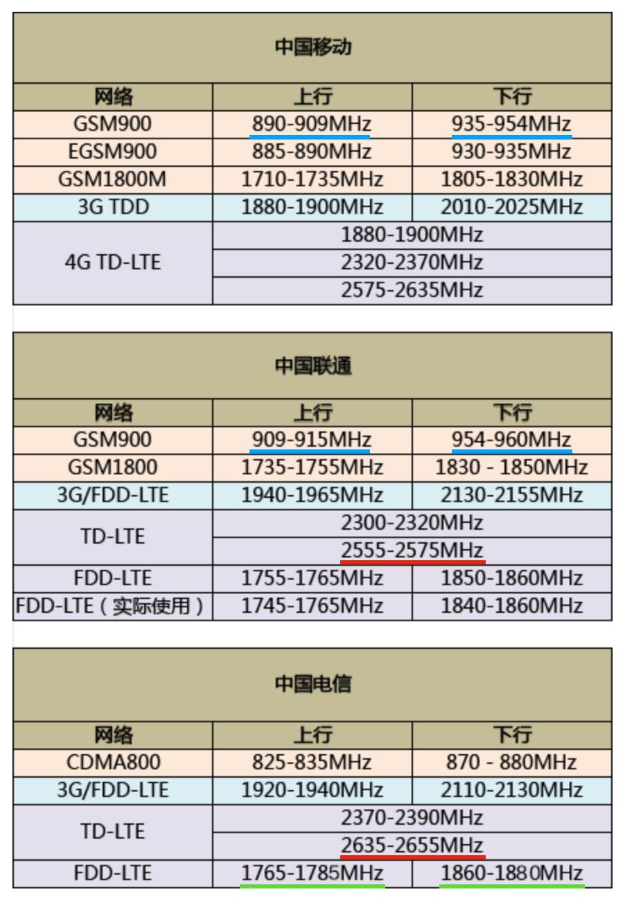 但比较运营商4G时代的频率资源分配,你会发现,在中国移动获得的2515MHz-2675MHz的160MHz频段中,2555MHz-2575MHz被联通占用,2635MHz-2655MHz被电信占用。8 H9 L7 H! }6 F