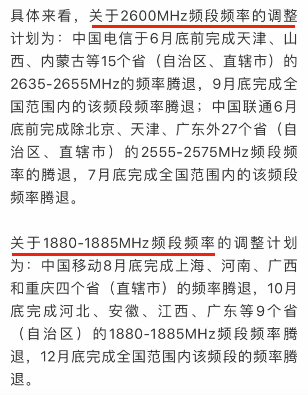 因此,联通和电信需腾退这两大频段给中国移动5G。