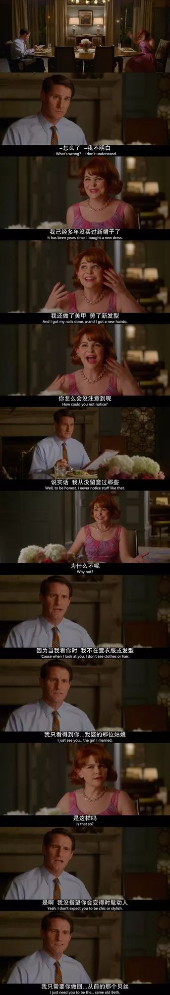 8 h) B& u& Y1 J费尽心思打扮自己希望重新吸引丈夫的目光,却被忽视。因为这个丈夫只需要一个会洗衣服做饭的她,与她的外表是否漂亮根本无关。
