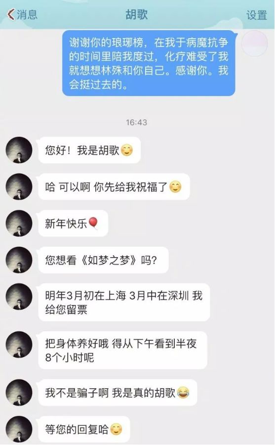 去年年末,一名白血病女孩在微博向胡歌致谢:“谢谢你的琅琊榜,在我与病魔抗争的时间里陪我度过。”没想到一条简单的感谢,却意料之外得到了回复。