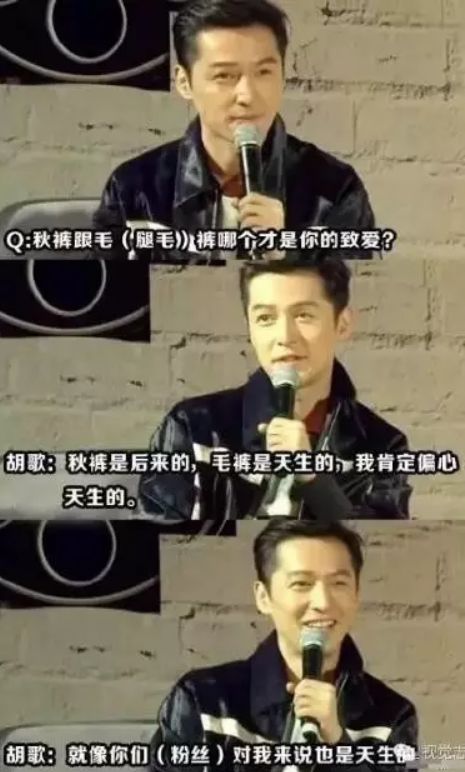 在粉丝面前,他是个撩粉“老手”,情话信手拈来。某次被问秋裤和“毛裤”哪个是真爱。胡歌回答,毛裤是天生的,我偏爱天生的东西。就像(粉丝)对我来说,也是天生的。& p+ W0 C _2 m* B# z& H
