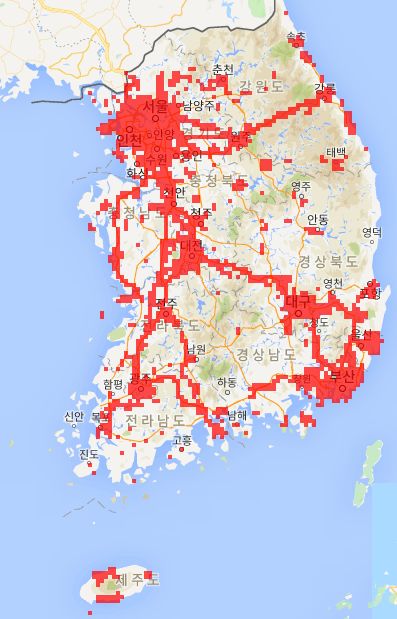 ▲韩国5G覆盖图(KT)3 p/ T7 B+ O6 C; D% t