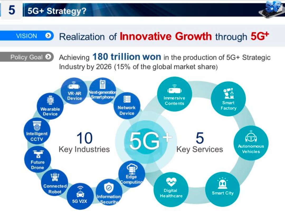 韩国5G+战略主要包括五大核心服务和十大核心产业。