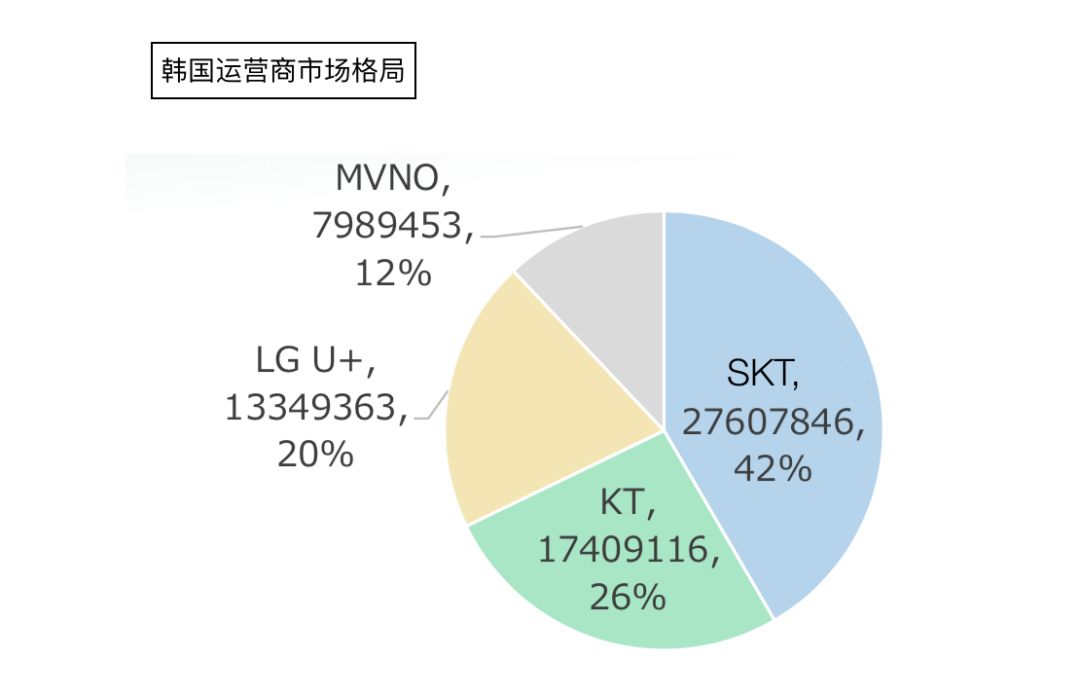 ( h0 w0 k C# Q& J3 G韩国电信市场的竞争格局主要由SKT、KT和LG U+三大移动运营商与虚拟移动运营商(MVNO)组成。
