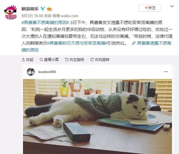 * l: t. q/ M9 R" I+ V: Y这理由把我整懵了,据说有两只猫是男方的,可是这样懒的男人不分手留着把他喂猫吗?让他滚,不让他带走猫;让他留下应付的赡养费,带着猫滚;都是可以理解的,但这么讨厌的一个人就是不和他离婚,是什么逻辑?