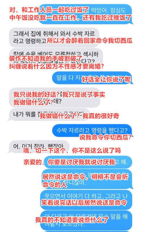 另一段具和安的短信是韩国媒体放的,又是在琐事上来回打转,关于切西瓜也能吵一大篇,看得人脑壳痛: