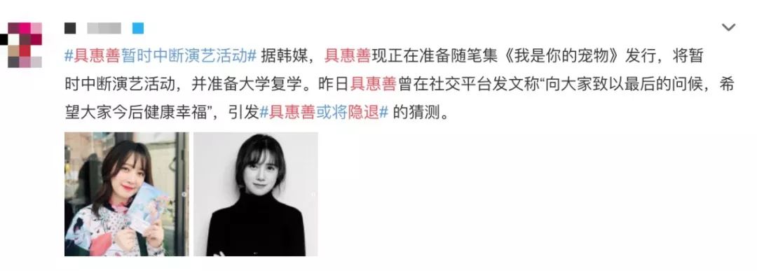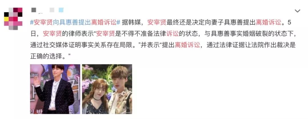 2 k/ ~8 h$ o1 c4 z* `7 k& x( `9 Q从具惠善8月18日在社交平台发文称“因进入倦怠期而变心的老公(安宰贤)想要离婚,而我想要守住家庭”后,这出婚变大戏就开启了击鼓传瓜模式,鉴R师、离婚协议金、萝卜牛肉汤、婚姻准则、外遇......据表姐统计,两人的婚变已经足足贡献了36个热搜,吃瓜群众更是热情高涨,拿出了看连载小说的劲头。