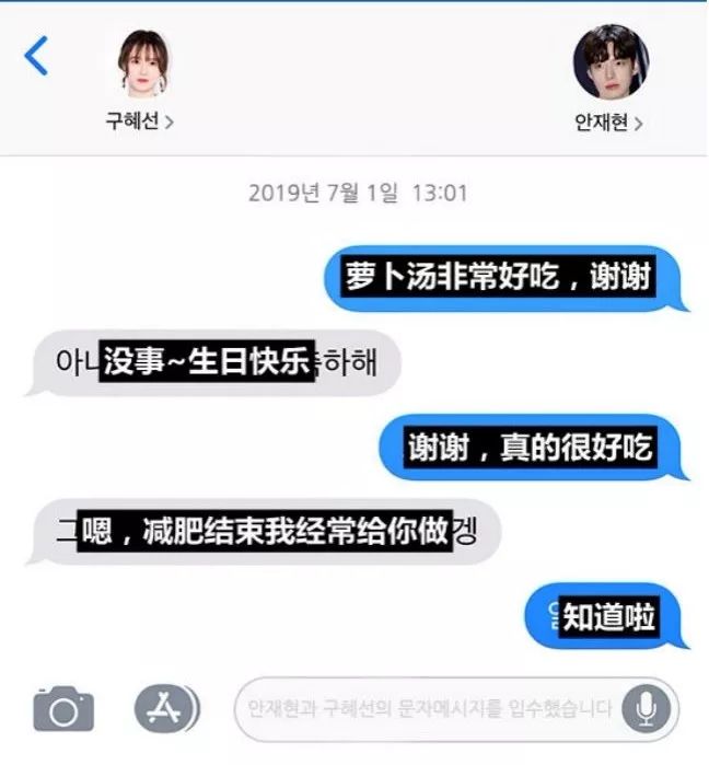 2 x7 s: T( i3 C0 N4 g具惠善曾说安宰贤“生日那天想吃萝卜牛肉汤,我从凌晨就开始准备煮了,但他只吃了一两勺后就去外面和别人一起过生日了”,但从爆光的内容看,男方曾发送感激短信。