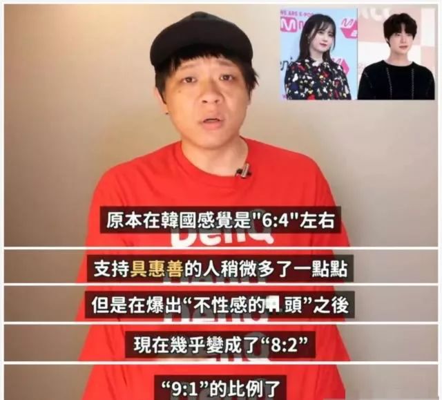 在离婚风波之初,具惠善通过“他好像只是短暂的爱了我一下”、“像说服我结婚一样,离婚也负起责任说服我”、“我是住在家里的幽灵,你曾经那么爱过的那个女人变成了僵尸”等金句塑造了“婚姻关系中受害者”的形象,字字诛心下,两人的支持比例一度呈现出一边倒的状况。( v7 _2 i' A3 k5 c( j