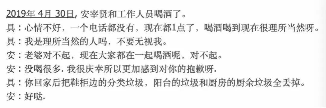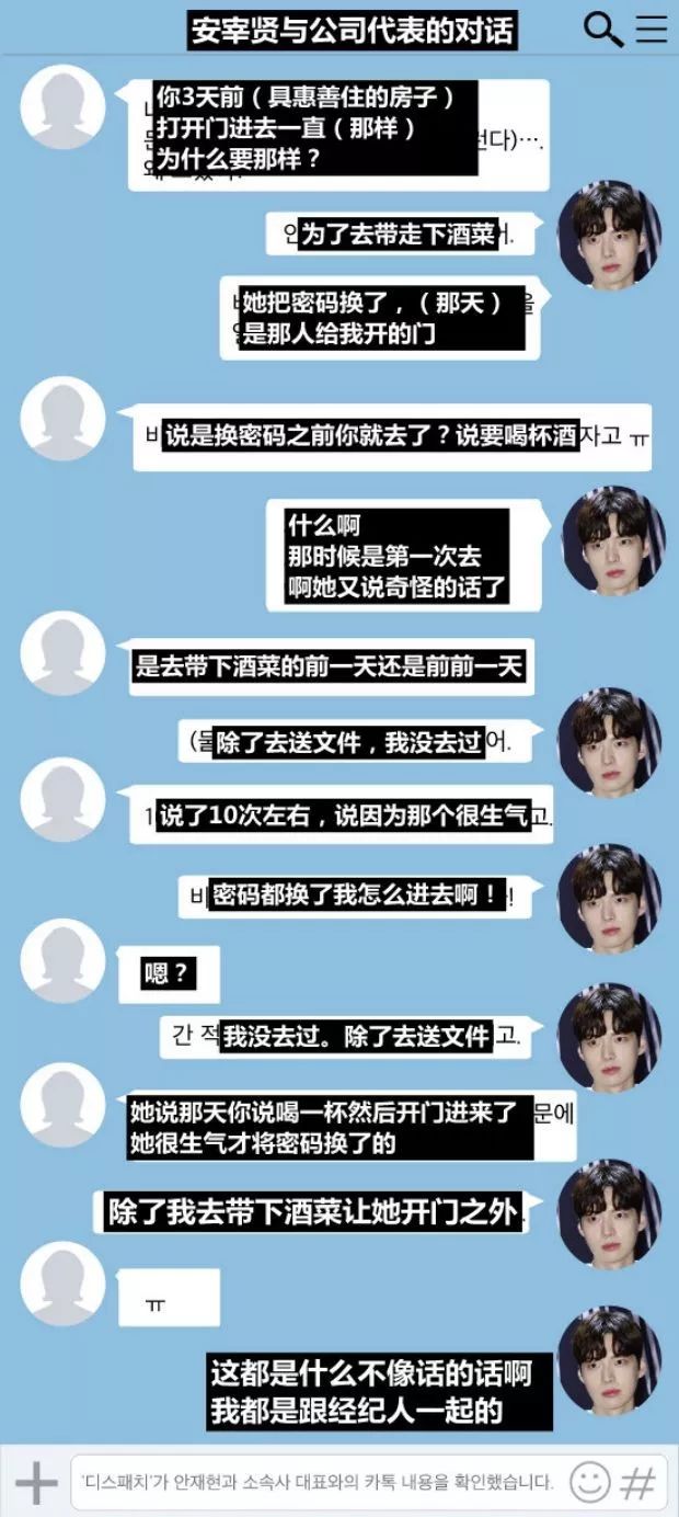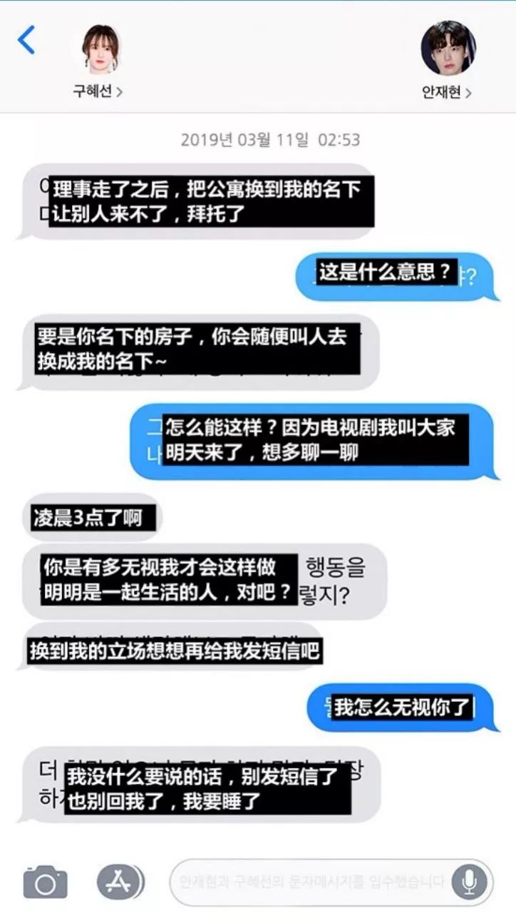 & k& h1 D) Z$ U8 w7 U' Q8 M2019年3月11日,安宰贤把公司理事带去龙仁的住所讨论电视剧,具惠善从二楼向一楼安宰贤发出了短信。