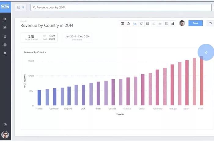 / u% _% c: f) G5 m; nThoughtspot还支持“人工智能驱动”的分析工具SpotIQ,用户可以在查询结果数据上运行它,使用统计和机器学习算法发现异常、趋势线、集群和其他数据特性。SpotIQ为它所揭示的任何洞见生成自然语言的叙述。如果这听起来像是谷歌对 BI 的“谷歌化”,那么这并非偶然,因为该公司几位创始人都是谷歌的校友。