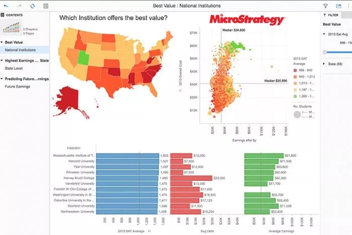 ' I+ X S* |- }; K T& r4 P( dMicroStrategy将自助服务的可视化数据发现和分析与适合大型记录系统的企业分析和报告相结合。它为数据使用者和高级用户角色提供了一个集成平台,其中包含许多不同的许可选项。客户端可用于web、桌面和移动端。服务器可用于报告、智能、内存分析、事务、分发、协作、地理空间服务、徽章和遥测。驱动程序可用于关系数据库、OLAP和Hadoop。
