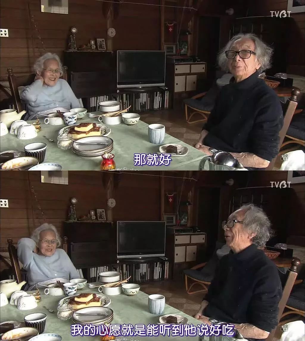 问及爱情保鲜的秘诀,他们共同谈到了生活的点滴细节中来。 比如奶奶喜欢吃面包当早饭,爷爷则更喜欢米饭配海苔、纳豆等小菜,他们就会准备两份不同的食物。 修一爷爷不喜欢吃蔬菜,奶奶就默默地把蔬菜榨成汁,而不是硬塞给他吃。 英子说:“我做饭的最大心愿,就是听到他说‘好吃’”。 修一说:“每次吃到英子做的饭菜,都迅速夸赞——真好吃。” 一食一羹很平淡,但用心做料理的心情却满满当当,全是爱意。