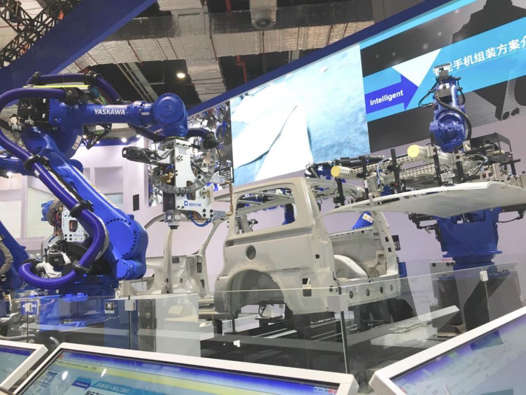 安川电机展位工作人员介绍:“相比同行,安川利用其机器人纤细的体型,可以在一个工位多配置机器人,从而减少工位数,缩短产线长度,提高整体节拍,提高产品生产品质,降低电费消耗。”+ J$ w& P; \9 I