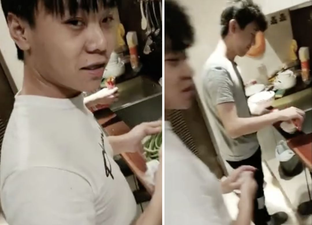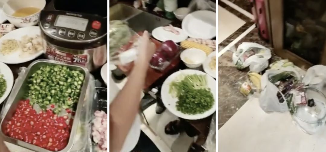 另外还有鸡蛋、洋葱、葱花蒜苗正在准备,小凯还拍了一下地上,有好几袋子的菜,看来今天要好好吃一顿了。那么,为小凯下厨的人是谁呢?