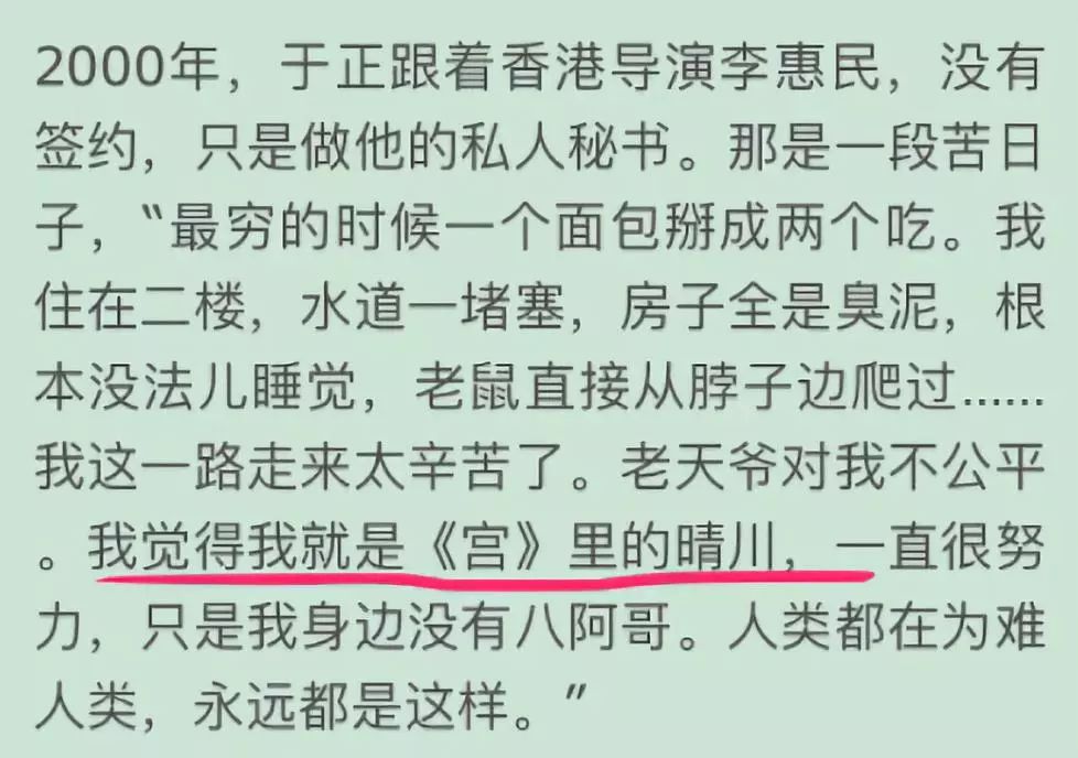 当时,于正掏心掏肺的和媒体诉说自己曾经的苦难:我觉得我就是《宫》里的晴川。. P' ~. u) G0 o