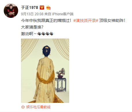 8 x+ l1 c$ ^8 c8 N" g他在微博上宣传“将有真正的嫦娥助阵”,还po了一张女演员的古装背影:6 G, K( ^- f& U