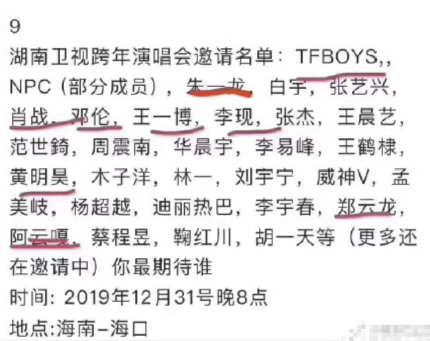 十一长假过去后,网友又开始期待元旦了,再过两个月就是元旦假期,各大电视台也要开始筹备元旦晚会了,这不,有网友晒出了湖南卫视跨年演唱会邀请名单,除了有肖战、王一博、李现这些暑期热门明星外,TFBOYS组合的名字也在其中,这是不是意味着,TFBOYS将在跨年演唱会上合体了? 6 U: S' I, W- O- o
