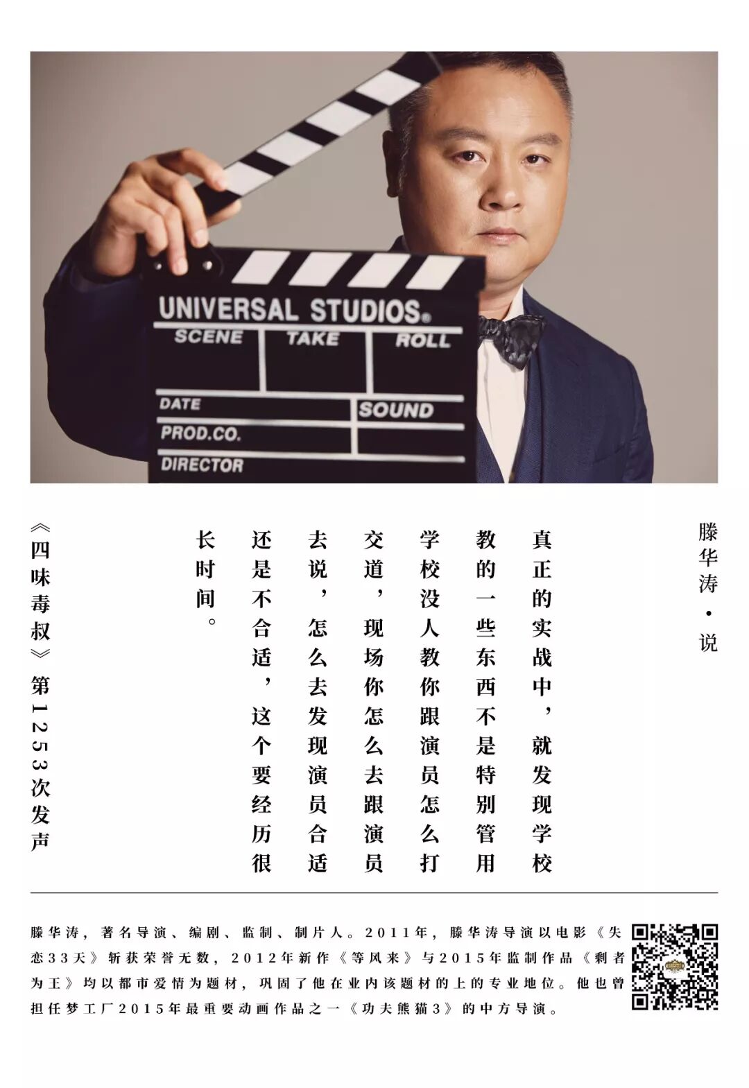 滕华涛:对,一个杂家。你学习的时候,还是要学个专业,那个时候自己本身比较爱写东西,所以选的文学系,至少从编剧入手,知道剧本是怎么样的。那我觉得把这个解决之后,你后面到了真正的实战中,就发现原来学校教的一些东西好像不是特别管用,还是得面对剧组实际且具体的一些工作、要求,学校没人教你跟演员怎么打交道,那现场你怎么去跟演员去说,表演的状态怎么去拿捏,怎么去发现这些演员合适还是不合适,这个中间我自己也经历了好长时间。1 K0 [+ Q1 p: Z; t3 p