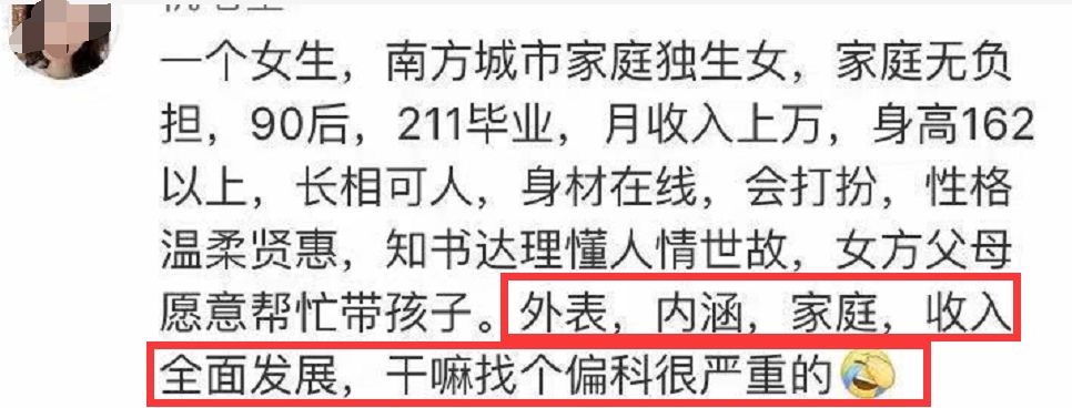 ; ]# ^; T3 \3 Z如果她在微博发一个类似征婚帖,大家就理解女生的不爽感从何而来了。 本姑娘农村户口,年薪170万,身高160,容貌普通。征夫,身高180以上,专一,爱健身有腹肌,211大学毕业,月收入至少过万。- ?7 B4 x' Z( q& x$ \5 |" A. H2 ~ m