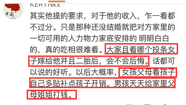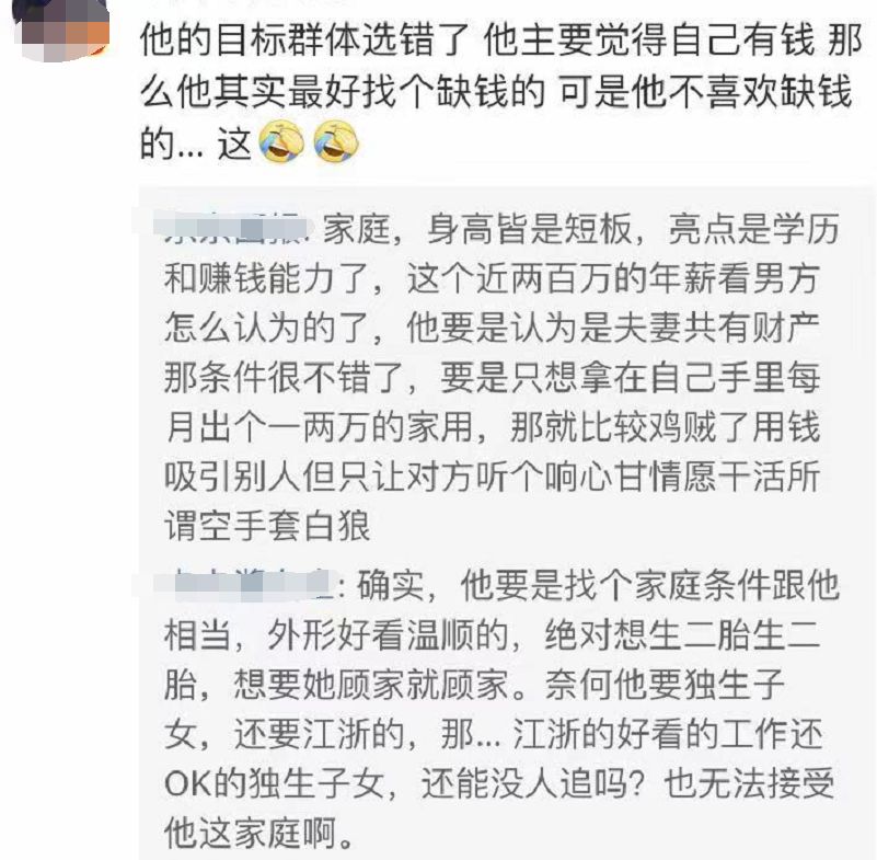 k% s R- c. t+ y% g想娶独立自强、不差钱、不拜金、有情调、有认知的姑娘,回家当伺候全家的女仆,是这个帖子隐藏的最大矛盾。我不觉得这个男生不优秀,客观说,他条件挺好,但是他想找的那种女孩,跟他不可能有一样的三观。