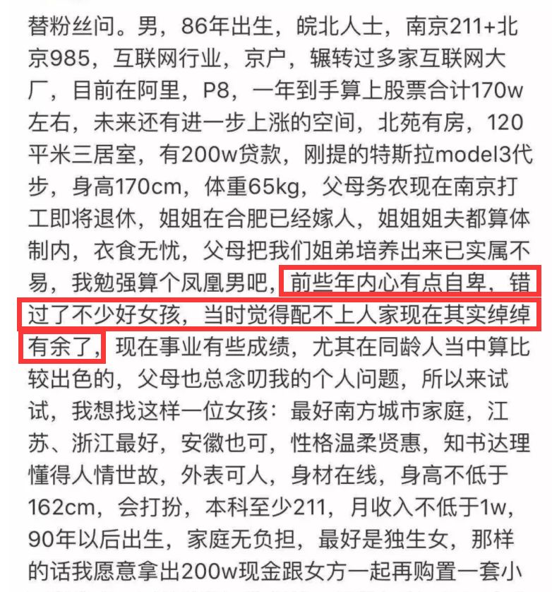 最近有一个阿里P8男征婚的帖子火了。