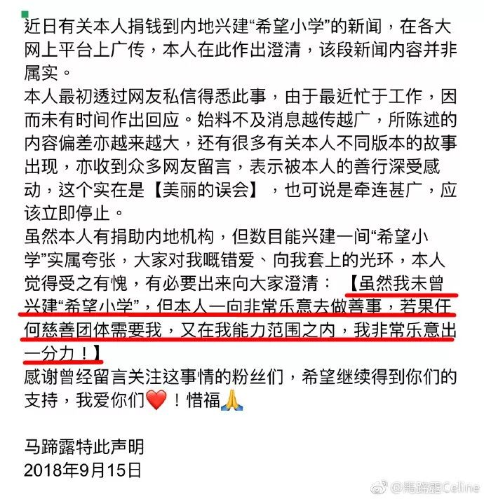 逼得她本人都跑出来澄清:这不是我干的!虽然我有捐助内地机构,但建希望小学实属夸张,本人觉得受之有愧。