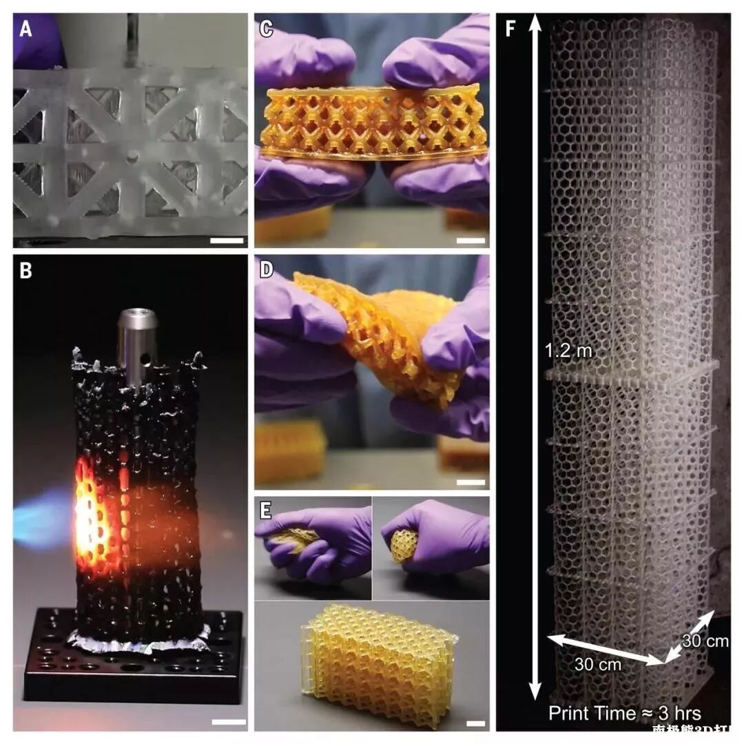 △支持不同的材料种类:A.硬质可加工聚氨酯丙烯酸酯零件(打印速率为 120 μm/s,光学分辨率为 100 μm);B.后处理的碳化硅陶瓷印刷晶格(打印速率为 120 μm/s,光学分辨率为 100 μm);C&D.松弛状态和张力下的印刷丁二烯橡胶结构(打印速率为 30μm/s,光学分辨率为 100 μm);E.聚丁二烯橡胶在压缩后恢复为膨胀的晶格(打印速率为 30 μm/s,光学分辨率为 100 μm);F.在不到 3 小时的时间内打印出约 1.2 米的硬质聚氨酯丙烯酸酯晶格(垂直打印速度为 120 μm/s,光学分辨率为 250 μm);比例尺为 1 cm(来源:Science)
