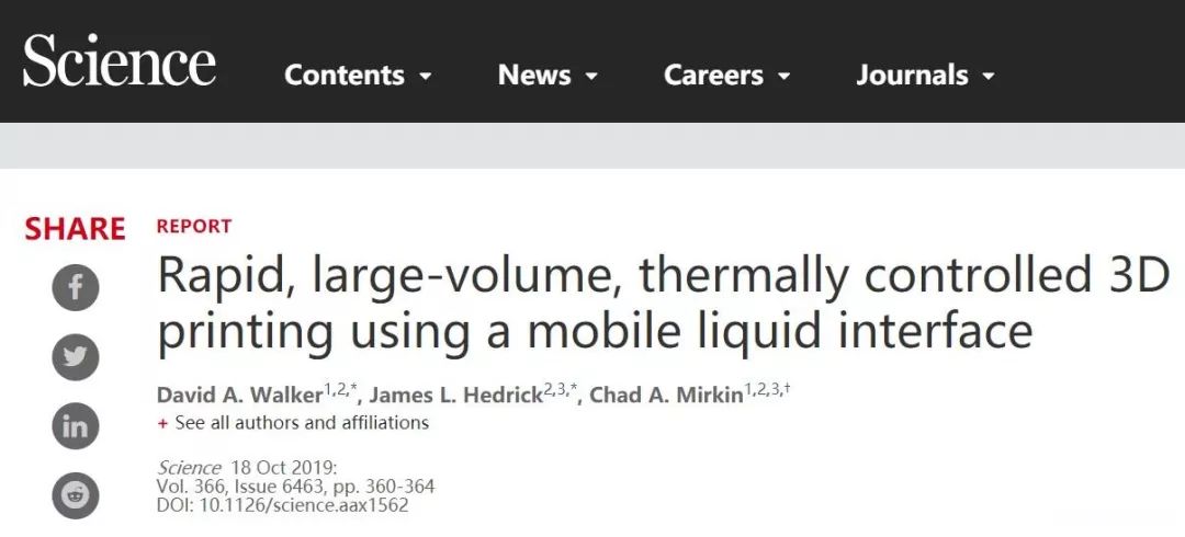 / G/ Y' j' y4 [; x△《Rapid, large-volume, thermally controlled 3D printing using a mobile liquid interface》,David A. Walker, James L. Hedrick, Chad A. Mirkin Science 18 Oct 2019: Vol. 366, Issue 6463, pp. 360-364 DOI: 10.1126/science.aax1562