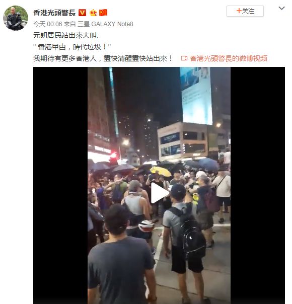 22日凌晨,香港“光头警长”刘sir在微博发布了一段大批市民齐声高喊" 香港曱甴,时代垃圾!"的视频。并附文表示:元朗居民站出来大叫:“香港曱甴,时代垃圾!”我期待有更多香港人,尽快清醒尽快站出来!↓