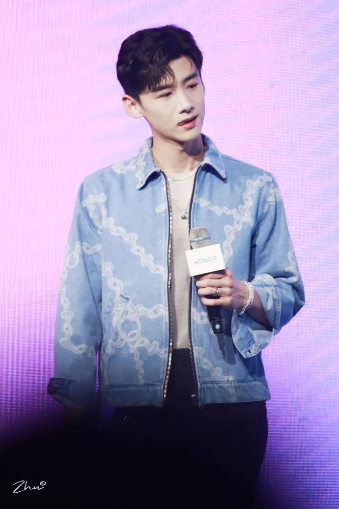 白敬亭身着印花牛仔外套出现品牌活动# L0 C' R4 z, u8 R1 h# d( s