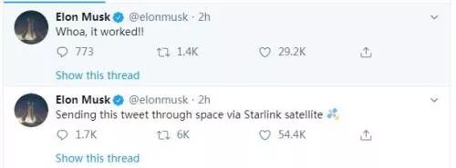 马斯克通过SpaceX星链卫星发布首条推特6 y' w/ S0 w# A& g