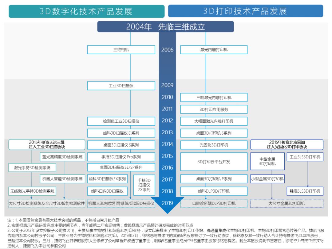 在资本的加持下,彼时主要聚焦于三维扫描技术和产品的先临三维开启了战略布局的脚步,先后设立了从事工业级金属/尼龙3D打印机研发的北京易加三维,从事3D云打印服务的先临云打印,并购了工业三维扫描领域的龙头企业北京天远三维,从事桌面级3D打印机研发的南京宝岩等公司。先临三维也开始了加速狂奔,2014年营收1.15亿元,2015年营收1.9亿元,2016年营收3.13亿元,2017年营收3.63亿元,2018年营收4.12亿元,2019年上半年营收2.16亿元。从产值上,一直处于行业领先位置,如今的先临三维已经拥有从3D扫描、智能设计、到3D打印的3D数字化设计与制造系统解决方案。