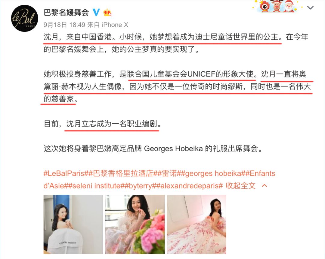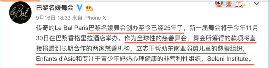 8 x ~. P, \# y; X/ R不过,要说“最美星二代”,似乎还是没有超越邱淑贞的大女儿沈月——今年的巴黎名媛舞会,沈月也收到了邀请函。大会给她的评价是“伟大的慈善家”。↓↓