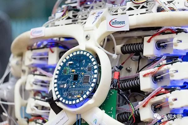 * h& }* j$ @4 o: s虽然Roboy拥有了自己的骨骼结构和肌肉系统,但是如何与人沟通、如何利用肌腱驱动完成精准的动作、如何行走等等,依然是一套组合难题。为此,英飞凌的研发人员为其装载了一套发达的神经网络系统,也就是英飞凌的半导体器件,从而赋予了“小男孩”听觉、视觉和感知功能。