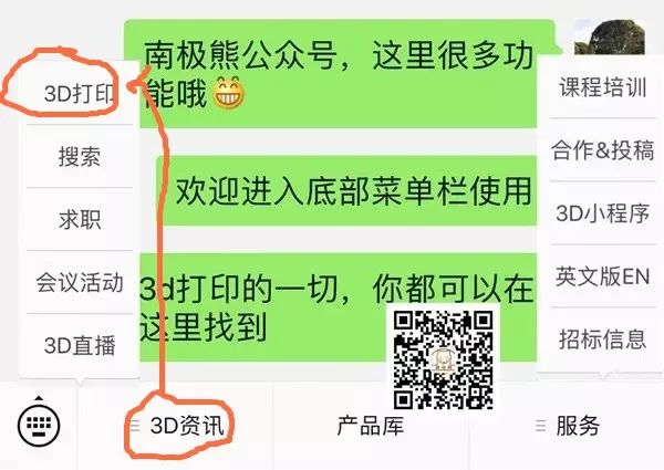 南极熊微信公众号底部菜单栏入口:“3D资讯”→“3D打印”& d& b; f1 H5 G. K& ~