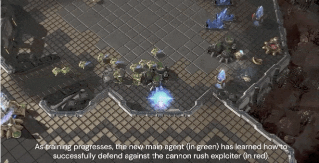 然后,一只新的主要玩家 (小绿) 就学到了,怎样才能成功抵御小红的cannon rush技能: