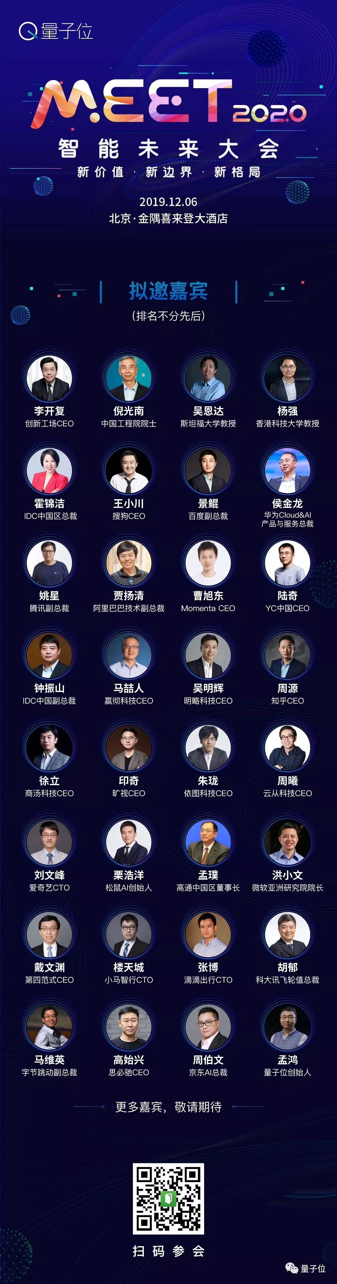 ) R- g6 H( u" ^' W# `) w/ P量子位 MEET 2020 智能未来大会启幕,将携手优秀AI企业、杰出科研人员呈现一场高质量行业峰会!VIP票即将售罄,快扫码报名吧~ _$ f- C# O* Z" |