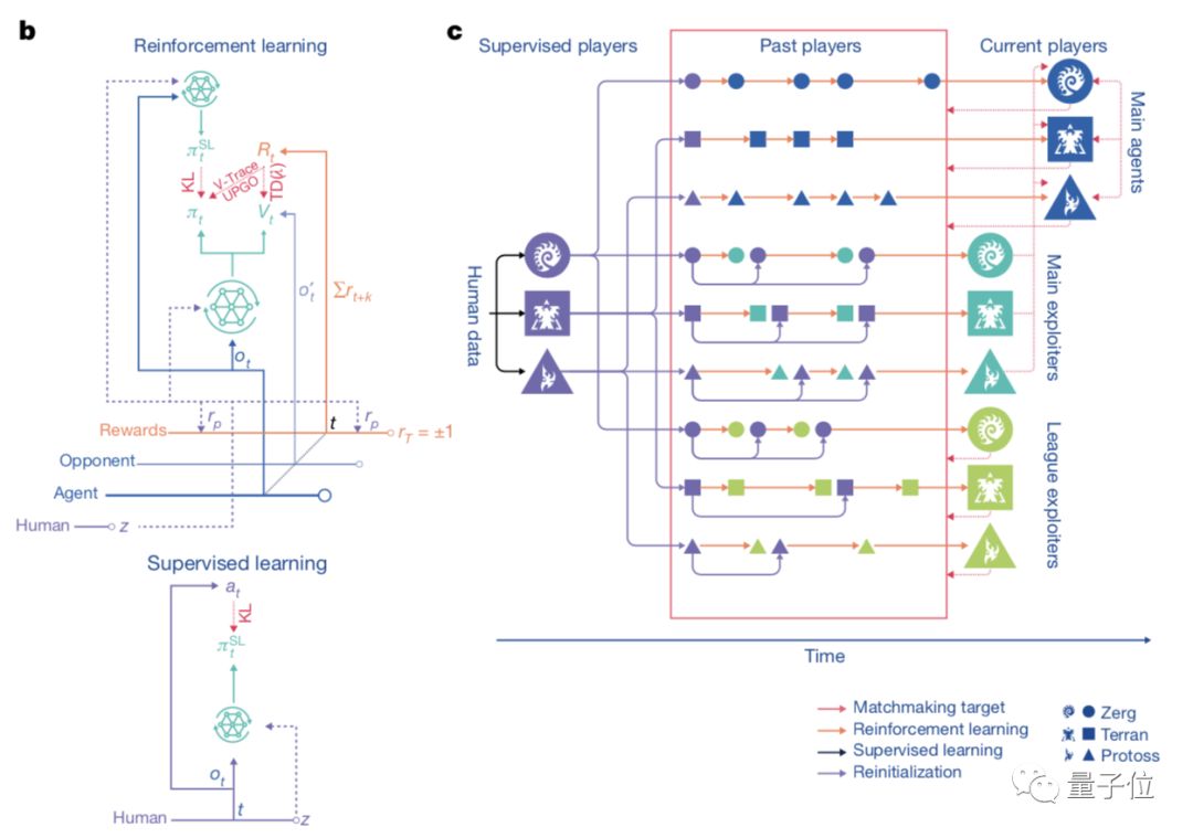这些资料可以让AlphaStar通过模仿星际天梯选手的操作,来学习游戏的宏观和微观策略。