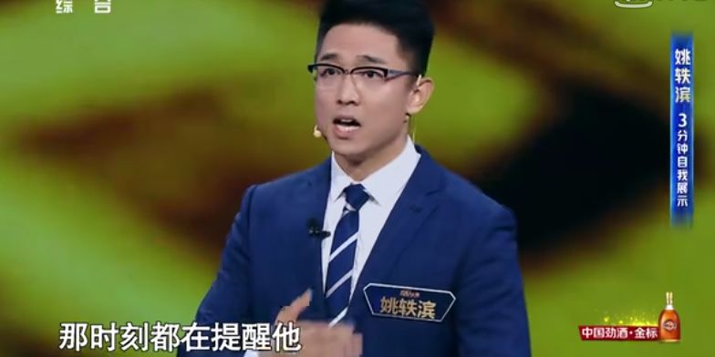 4 T1 C1 o- t8 l+ j% J8 p第一位选手是央视的主持人姚轶滨,他的自我展示非常别具一格。