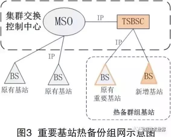 用群组基站组网方式实现基站覆盖的热备份,在原有重要基站附近再建设一个参数相同的基站,两个基站组成群组基站而同时工作。因为使用相同频率工作,不互相干扰。任何一个基站故障,由于两基站覆盖范围大致相同,在覆盖区内电台终端仍能接受信号,正常通话,不受影响。这样能最大程度增强系统的可靠性。