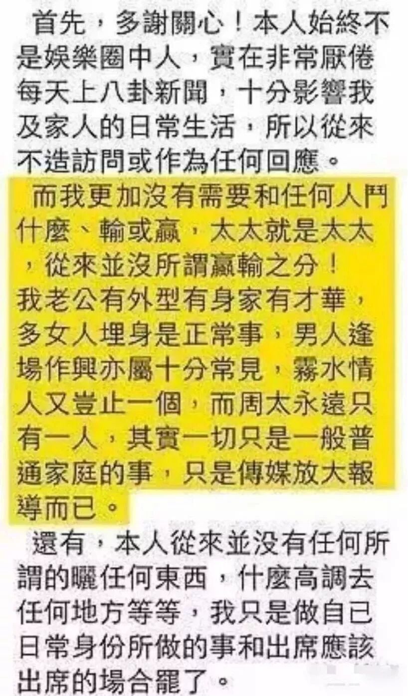 陈慧玲保住了周太的名份,大方表示:没意见。