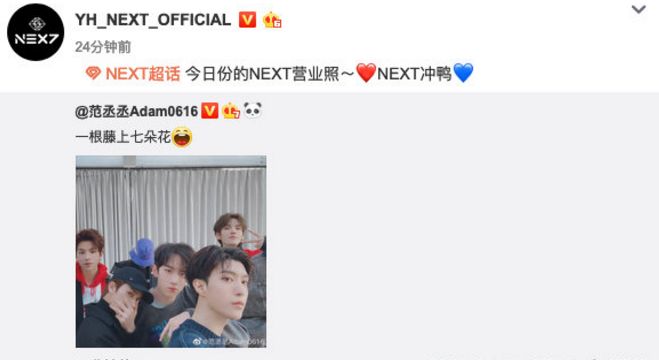 0 @- X3 @& w( z3 o7日,范丞丞在微博上晒出乐华七子“NEXT”的自拍合照,并配文:“一根藤上七朵花”。随后,组合官博转发配文“今日份的NEXT营业照”。此前,有传言称范丞丞已与乐华解约,对方没有做出回应。