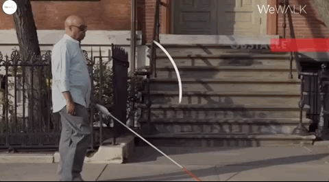 4 H2 X, u& H' E: c" _3 @WeWalk 智能手杖配备了内置扬声器、语音助手、谷歌导航和传感器,使用超声波传感器检测胸部上方的障碍物并通过振动发出警告,手势操作,方便盲人外出。售价499美元。) B. b" p- n: u* K, K
