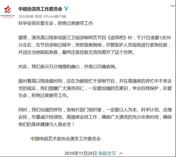 11月28日,中国演员工作委员会官方微博@中视协演员工作委员会就高以翔去世一事发声,表示万分惋惜和痛心,并致以沉痛哀悼。