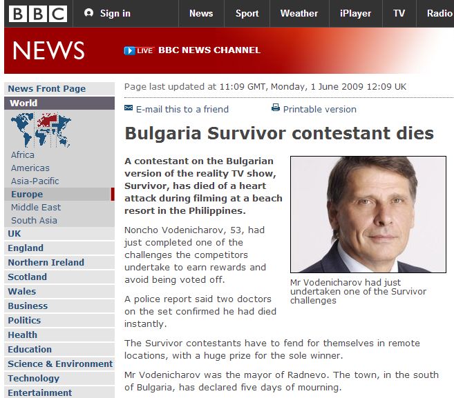 $ E' y* \7 P; }* y l真人秀节目《幸存者》保加利亚版在2009年拍摄的一期节目中,53岁的诺乔·沃德尼查洛夫在菲律宾的一个海滩度假胜地拍摄期间死于心脏病突发。沃德尼查洛夫是保加利亚南部Radnevo镇的镇长,年轻时还当过电影特技演员和歌手。