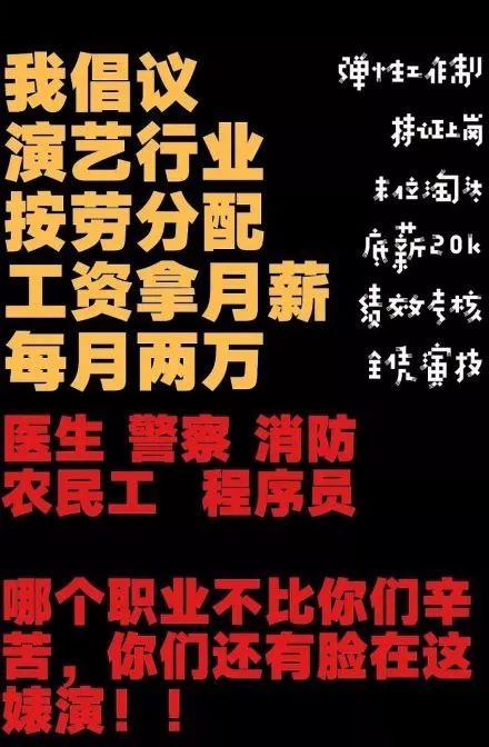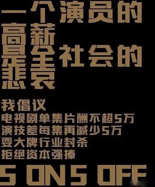 ) W" ~1 O% c, O! m( U( n倡议演员单集片酬5万,演技差每集减少5万,耍大牌行业封杀,拒绝资本强捧。