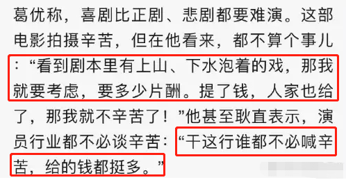 - `" o% r+ y% C5 A看到剧本里有上山、下水的戏,那就提钱,拿了钱,我就一点都不辛苦了。