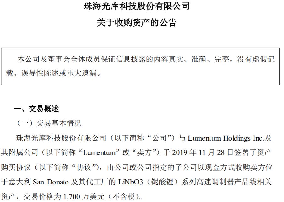 收购|光库科技拟1700万美元收购Lumentum铌酸锂高速调制器产品线资产 |