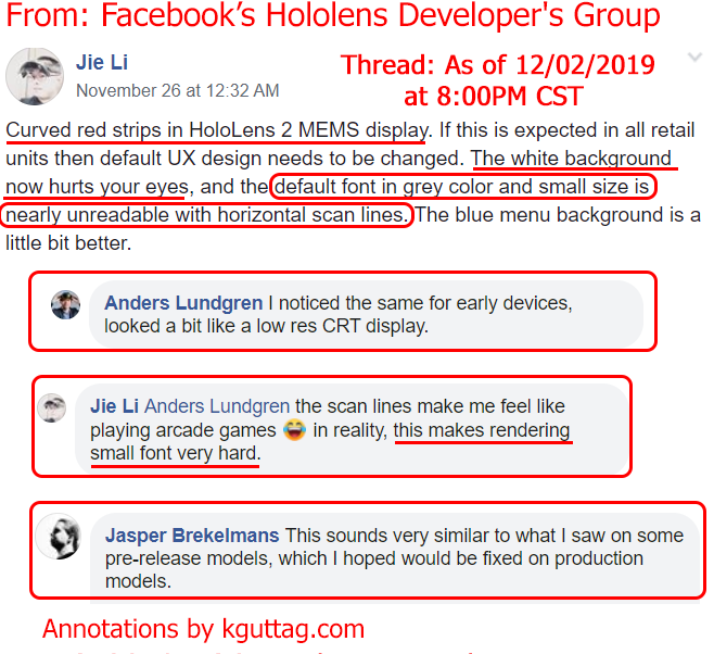 5 k5 | k9 Y- O; O0 A$ ?0 f) d: |" R本周,Karl Guttag博客发文表示:Facebook上HoloLens开发人员小组中,已发现2例有关HoloLens 2在图像显示存在缺陷的案例。9 h) t* P! l3 \% G1 M